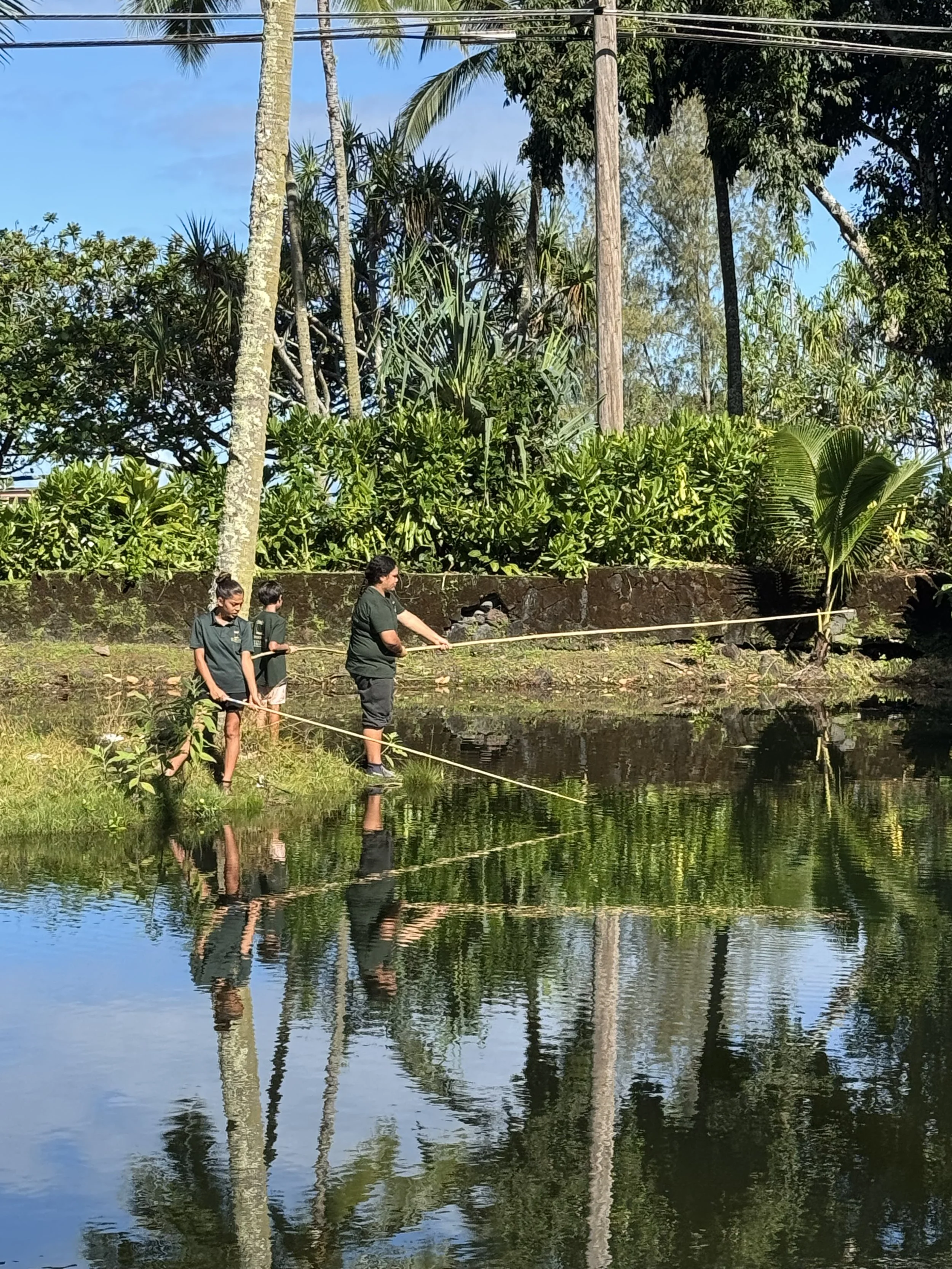 Through this work, students learn how sediment buildup affects water flow, pond function, and fish habitat, while also discovering ways that sediment can be repurposed to support healthy plant growth. Their efforts directly contribute to ongoing restoration and provide valuable insight into how traditional loko iʻa management blends cultural practice and ecological problem-solving.