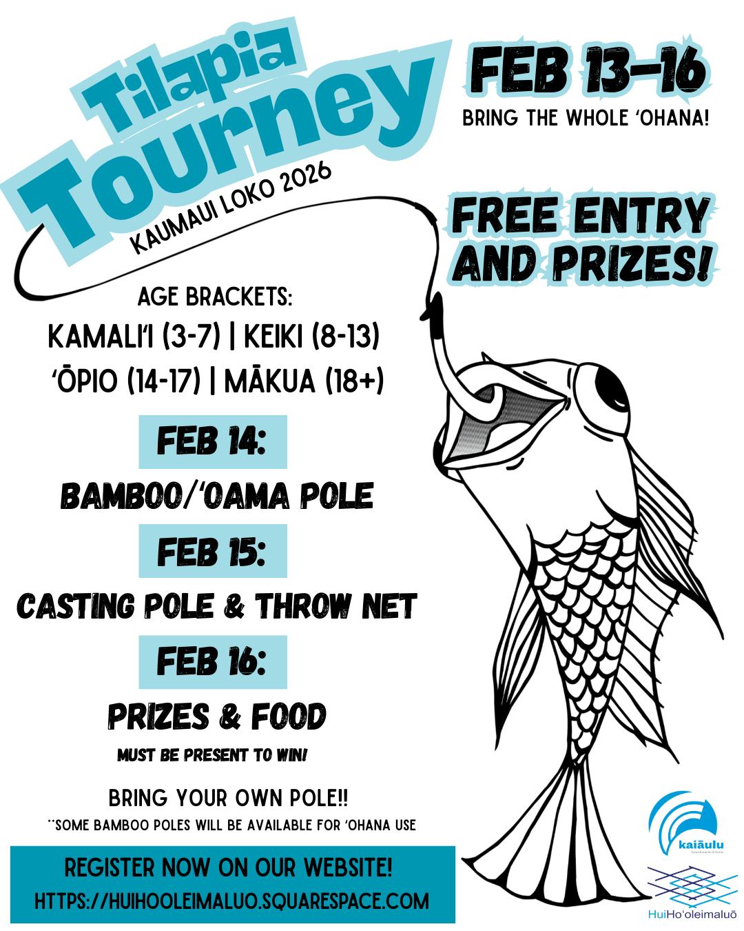 Kaumaui Loko is turning 5yo and we invite you to come down and celebrate with us as we host Hui Hoʻoleimaluō’s 2026 Tilapia Tourney happening February 14-16. Many hands have passed thru our gates to help transform this ʻāina into a meaningful outdoor learning environment and we would like to invite everyone who can to come down and have some fun with your family and friends while we relax and have some fun holoholo in these ponds. Besides the time spent with each other, you’ll also be contributing to the eradication of the number 1 invasive species here - Tilapia!